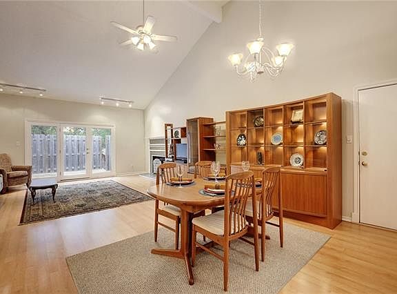 This adorable townhouse has been lovingly lived in and the owners pride shows. Updated master bathroom with a large steam shower, great after a hard day at work. The large, open living and dining area are perfect for entertaining your guests & family & the outdoor patio & yard only enhance your entertainment options. Kitchen has been updated as well. ceiling no longer blue. Storage area behind the garage and a nice yard. The community has a pool and clubhouse and is well maintained. Close to everything.