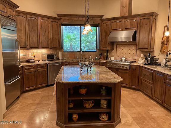 Carefree has a relaxed, upscale desert lifestyle characterized by scenic views,natural rock formations, desert vegetation, and a focus on outdoor living.Thoughtfully designed with high-end finishes custom lighting & smart home technology & 8' alder doors.This home offers a spacious split floor plan with elegant travertine floors and abundant natural light throughout.The chef's kitchen opens seamlessly to expansive living areas, creating the perfect setting for both entertaining and everyday living. Step outside to a resort-style backyard featuring a covered patio w/ misting system, infrared heaters, sparkling pool accented by custom water features & Travertine pavers creating a true oasis, outdoor fireplace, built-in BBQ, & lush landscaping with mature Saguaros & perfect Black Mtn Views. The extended 3-car garage boasts soaring ceilings with ample room to stack and showcase your most prized cars.Complete with storage cabinets and epoxied floor.A true desert retreat, this home blends sophistication, comfort, and timeless beauty in one of Carefree's most desirable settings.