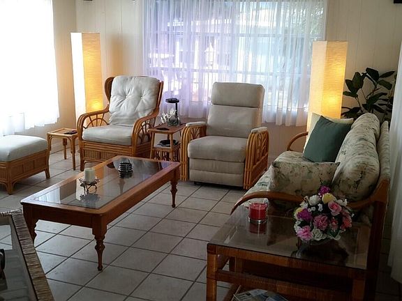 Cozy Immaculately maintained fully furnished 2 Bedroom, ceramic/laminate flooring throughout. Large 200 sq ft Florida Room, walk out from your living space no stairs into your secondary living space, that is fully insulated and can be used as a great room and for entertaining, all windows and screens throughout. Great outdoor space for BBQ's. Move-in ready! A Must see! Everything has been perfectly maintained. 24 hour manned gate, 55 plus community. Development offers many social activities, Clubhouse, 2 pools, billiards, bocce ball, shuffleboard, on-site Library and so much more. Water/lawn maintenance and wi-fi included. Centrally located close to the Beach, 95 and the Turnpike, lots of shopping near by, restaurants and so much more.....