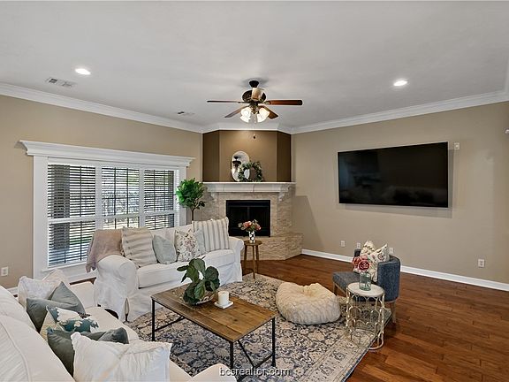 Beautifully Updated Home in the Heart of Bryan, TX! This stunning four-bedroom, three-bath residence blends timeless style with modern updates for comfortable living. The spacious, light-filled layout features hardwood floors, a cozy fireplace, and an open-concept design perfect for entertaining. The chef’s kitchen offers granite countertops, new and updated stainless steel appliances, ample cabinetry, and a breakfast nook overlooking the beautifully landscaped backyard. The private primary suite includes a luxurious bath with dual vanities, soaking tub, and separate shower. Enjoy peace of mind with a brand-new roof, whole-home water filtration system, and a $1,500 carpet allowance for your personal touch. An 85-inch wall-mounted TV is also included! Additional highlights include generous secondary bedrooms, two full guest baths, and a two-car garage for added convenience. With classic curb appeal and a prime location near Bryan’s best shops, dining, and schools, this home offers the perfect blend of comfort, functionality, and Texas charm. But, best of all, instant equity is included, Brazos County Assessed Value is $496,000!