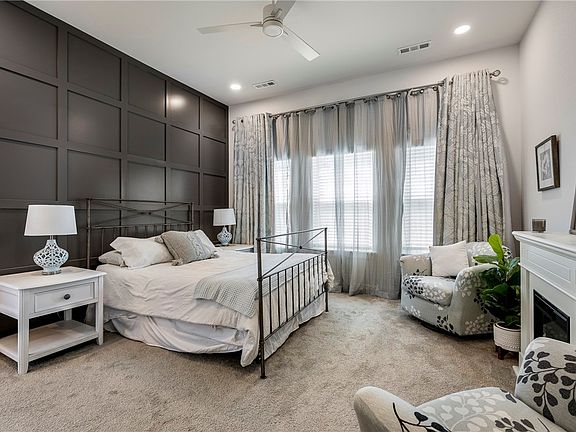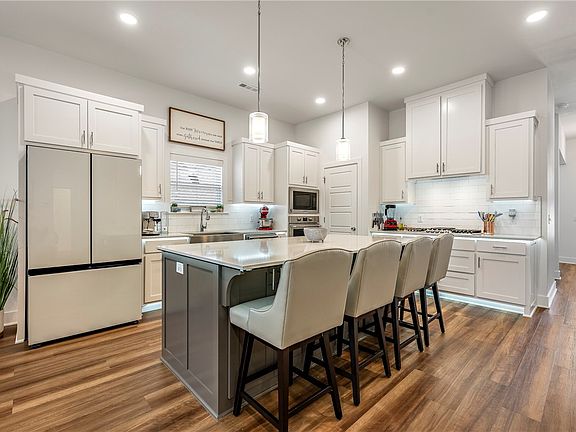 Welcome to this beautifully designed 3-bedroom, 2.5-bath home featuring a versatile office space and an inviting open-concept layout. The living room boasts a cozy fireplace with stylish shiplap detailing above the mantel, flowing seamlessly into the dining area and a chef-inspired kitchen complete with a large island & bar, quartz countertops, gas cooktop, and a spacious walk-in pantry. The private primary suite offers a custom feature wall and a luxurious en-suite bath with double vanities, a walk-in shower, and tub for relaxing, soaking baths. Enjoy outdoor living on the covered patio, surrounded by a privacy fence. Convenient location.