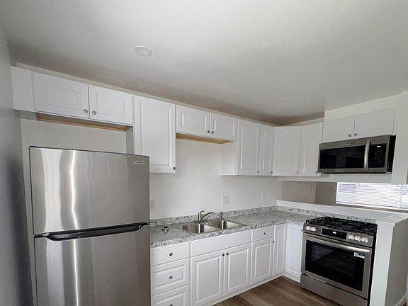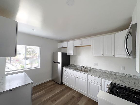 - Stainless steel appliances include a gas stove/oven, a refrigerator, and a built-in microwave
