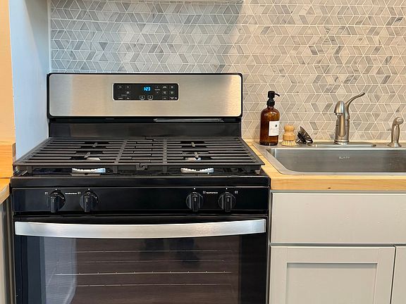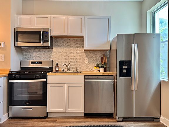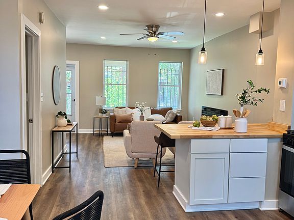 The chef-inspired kitchen features cabinetry, stainless steel appliances, butcher block countertops, decorative backsplash, and a spacious island offering additional seating and prep space. Luxury vinyl plank flooring runs throughout the home, enhanced by recessed lighting for a warm, modern feel. And a contemporary wall electric fireplace services as the living room's focal point, creating a cozy atosphere perfect for relaxing or entertaining.
