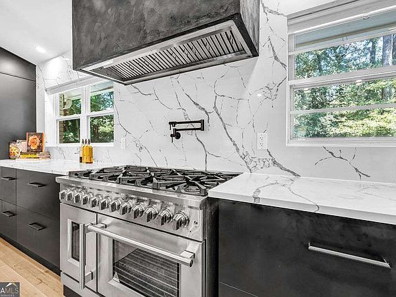 GORGEOUS 4 Level, 5 bed/ 3 bath Home with Chef's Kitchen & Designer Finishes in Atlanta GA! Stunning chef's kitchen, featuring a 48" 8-burner gas range with industrial hood, pot filler, oversized 8' island with black leathered quartz, built-in beverage station with wine fridge and an 11' vaulted walk-in pantry. Quartz counters and backsplash extend to the ceiling for a sleek finish! Serene primary suite boasts 11' vaulted ceilings, spa-like owners bath with double vanity, LED mirrors, walk-in shower, smart toilet, W/D hook-ups and an oversized two-sided closet with built-ins! both upstair secondary bedrooms feature vaulted ceilings, custom bookcases and ample storage. The spacious living room offers a fireplace, built-ins, a stylish bar with storage & lighting, and a secret door to the lower level- perfect for an added sense of privacy, secure spaces, or a fun surprise for guests! The fully finished lower level offers two additional bedrooms, a full bath, gym/flex space, laundry and barn doors for added style. This home is complete with refinished hardwood floors on upper levels & LVP on lower, adjustable can lights, new fans, abundant built-ins, and thoughtful upgrades . Enjoy the fully fenced backyard with multiple outdoor areas designed for both relaxation and entertaining. A two-level deck & private patio located beneath the kitchen deck - a perfect shaded retreat. New furnace & termite warranty in 2023. Move-in ready and FULL of high-end touches. NO HOA. Welcome Home!