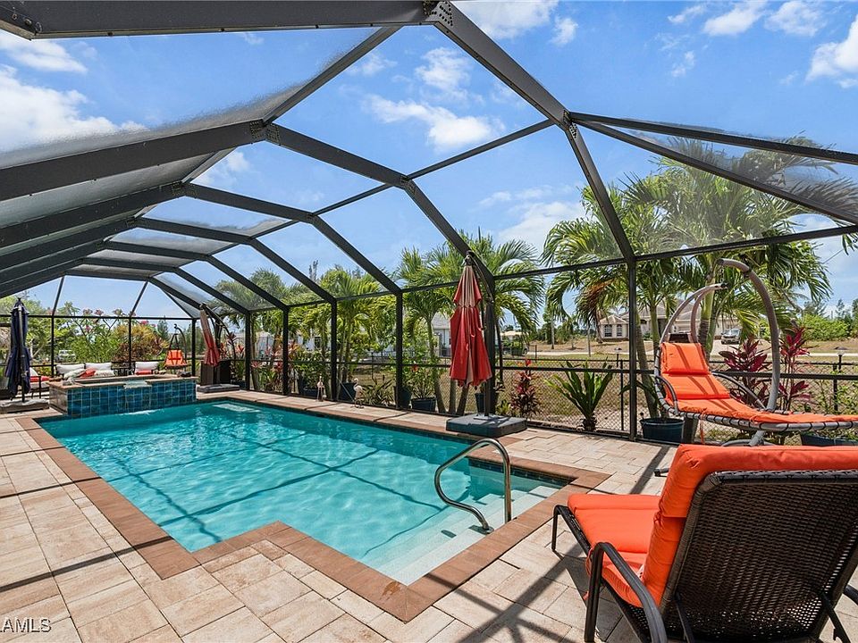 Your Private Tropical Oasis with Pool, Spa, Tiki Hut & Extra Lot – Live the Florida Dream! Welcome to your ultimate Florida retreat, where privacy, space, and resort-style living come together! This beautifully appointed home sits on an oversized ½ ACRE LOT with lush tropical landscaping, a custom pool and spa, and a huge tiki hut with a bar, creating an atmosphere usually found in luxury resorts. Boasting 2,276 SF living with room for everyone! This spacious and bright 4-bedroom plus den/office, 3-bathroom home also includes a highly sought-after 3-car garage and two open flex spaces near the entry – perfect for a home office, study, gym, bar, or creative retreat. Step inside to soaring cathedral ceilings, a wide open floor plan, and a modern kitchen ideal for both daily living and entertaining friends and family. The master bedrooms overlooks the private backyard and pool, offering a peaceful escape. The master bath features a stylish renovation with modern finishes. 3 additional well-sized bedrooms and a remodeled guest bath, great for families and visitors. Outside, your tropical backyard paradise awaits! Enjoy a custom-designed pool with water features, a large spa, and dual heating options (solar + electric) for year-round enjoyment. A massive tiki hut with power and lighting offers the perfect setting for outdoor gatherings, barbecues, or simply relaxing with your favorite drink in hand! The fully fenced yard includes two gated entrances, one of which is large enough for boat or trailer storage—ideal for anyone with outdoor toys or watercraft. A detached oversized shed offers even more flexibility—great as a detached man cave, home office, or additional storage. Recent upgrades include a brand-new roof (2023), new screens on the patio, a new pool pump, and a solar heating system for the pool. The kitchen is equipped with a reverse osmosis (R/O) system, and the home features a dual-filter water filtration system with UV light. All 3 baths have been remodeled, generator receptacle w/ transfer switch, main panel surge protector. Additionally, the septic system was pumped in January 2025. Situated in a prime NE Cape Coral location just minutes from boat ramps, parks, and access to world-class fishing, white-sand beaches, waterfront dining, and gorgeous barrier islands. Golfers will love being close to Coral Oaks and Palmetto Pines golf courses. Just min. from shopping, dining, local events, and spots like Starbucks, Target, and Publix, and some of the area’s top-rated restaurants. Ideally located near the planned Seven Islands development, which is expected to feature marinas, waterfront dining, boutique shopping, a park, green spaces, and possibly even a beachfront area. This property is not just a home—it's a lifestyle. Whether you’re looking for your forever home, a vacation retreat, or a long-term investment, this tropical haven is truly a rare find with everything it offers.