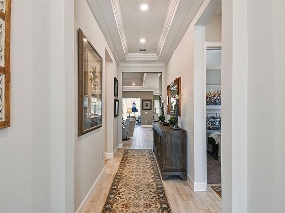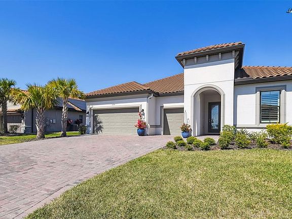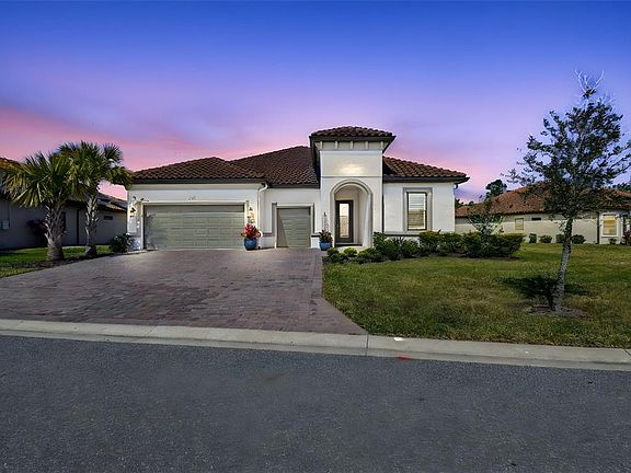 Better than NEW, extensive upgrades to this sought after LETIZIA model, uniquely designed with 3 separate sleeping areas. Each wing with a full bathroom for added privacy. Enter this home from a beautiful LEADED Glass door leading to a GRAND FOYER. Walk in & appreciate the beautifully appointed upgrades including porcelain plank tile flooring throughout main areas & carpeted bedrooms. Laundry room with newer Front Load Washer Dryer with plenty of cabinets & a utility sink. The TWO Car garage & GOLF Cart garage afford an EPOXY floor finish. The Kitchen offers extensive upgrades with pull out drawers, GE stainless steel appliances & stainless steel RANGE HOOD, Carrera Marble with a hexagon pattern tiled backsplash. The Kitchen island has a stone counter with a Ceramic FARMHOUSE SINK, front under counter cabinets for additional storage, Walk-in PANTRY with custom shelving. The home features a WATER FILTRATION system. Tray & Coffer ceilings, extensive use of CROWN MOLDING, PLANTATION SHUTTERS & CEILING FANS throughout. The 9ft SLIDING GLASS DOORS POCKET & OPEN unto your EXTENDED SCREENED LANAI for that true South Florida living. Sit back relax & enjoy nearby concerts or watch golfers on the Stonegate PUTTING GREEN from the privacy of your own backyard. This home is located on a Cul-de-sac minuets from Solivita's vibrant Town Center with easy access to restaurants, Pharmacy, the Riviera Spa (over 32000sf) including both an INDOOR & OUTDOOR POOL & two HOT TUBS overlooking the LAKE. Solivita rates as one of the best retirement communitiesin the US by 55places. Offering Tennis, Pickleball & BOCCE ball courts, 14 HEATED POOLS, Shuffleboard/Basket ball courts & MILES of BIKE PATHS. Small & Large Dog parks, TOT LOT Playground & so much more. Recently completed POINCIANA LAKES PLAZA is located directly accross SOLIVITA'S main entrance with shops, grocery stores & restaurants all within minuets. Come visit SOLIVITA today & call it HOME.