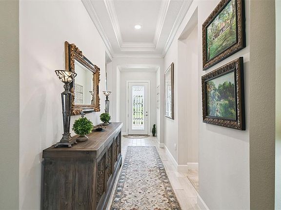 Extended screened lanaiKitchen islandCarpeted bedroomsEpoxy floor finishCeiling fansLeaded glass doorLaundry room
