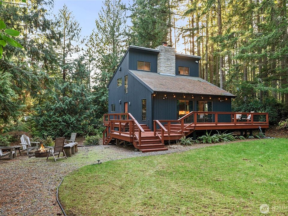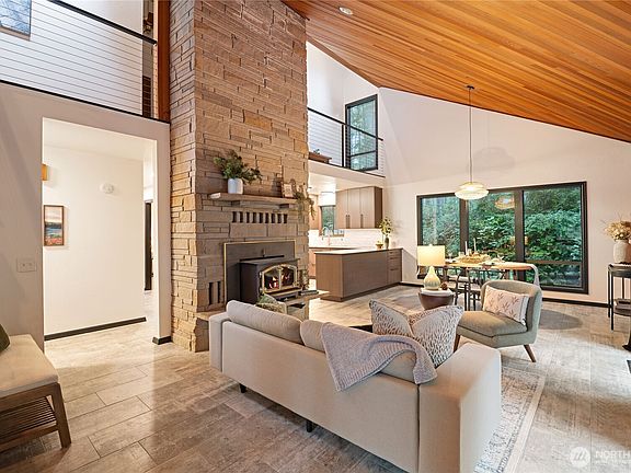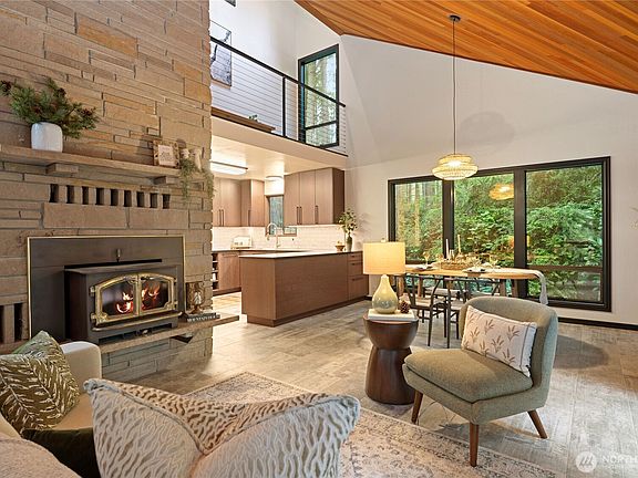 Nestled amid lush greenery & mature trees, this PNW Contemporary home offers a blend of natural serenity & modern design. Soaring ceilings & striking fireplace anchor the open-concept living area with sliders to full deck. A beautifully updated kitchen featuring sleek quartz countertops & contemporary finishes. Spacious private primary suite off the loft includes a distinctive five-piece bath & an adjacent wet sauna. Main floor offers comfortable bedrooms, a freshly updated full bath, the lower level features a recroom, ample storage & garage access. New septic 2025. Don't miss the enormous SHOP (70x24), with new roof, 200-amp 3-phase electrical service, holds 6 cars, perfect for hobbies or home based business. Prime Peacock Hill location.