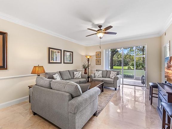 This first floor, turnkey furnished condo with an incredible golf course view must be seen to be believed! This beautifully maintained Veranda III residence is located in the highly sought-after Cedar Hammock Golf & Country Club, a premier bundled golf community in Naples. Offering 2 bedrooms plus a den, 2 full bathrooms, and a detached 1-car garage, this spacious home features 1,414 sq. ft. of living area (1,714 sq. ft. total including the front and rear screened lanais). Inside, you’ll find a bright open layout with crown molding, chair rails, and elegant travertine tile floors in the main living areas, complemented by luxury vinyl faux wood flooring in the bedrooms and den. The kitchen has been updated with quartz countertops, stainless steel appliances, and ample cabinet and pantry space. Enjoy peaceful mornings or relaxing evenings on either your front veranda or rear screened lanai—recently re-screened in 2025 and featuring Florida glass for added privacy. Notable updates include hurricane-impact windows, high end washer/dryer, new tile roof and exterior paint (2020), and surge protection throughout. The property also includes Wi-Fi readiness and plenty of guest parking nearby. Cedar Hammock offers a recently redesigned 18-hole championship golf course, practice facilities, resort-style pools, tennis and bocce courts, a fully equipped fitness center, and a beautifully renovated clubhouse with both casual and fine dining options, all within a guard-gated community just minutes from downtown Naples and the beaches. This is the one!