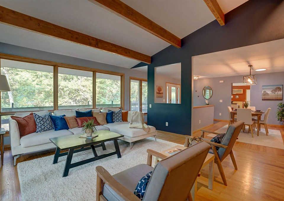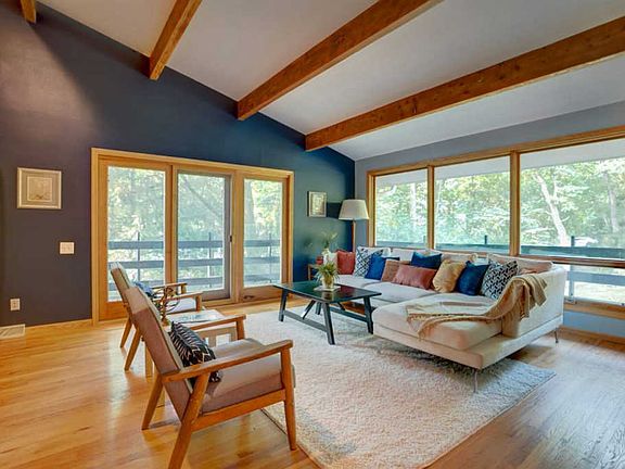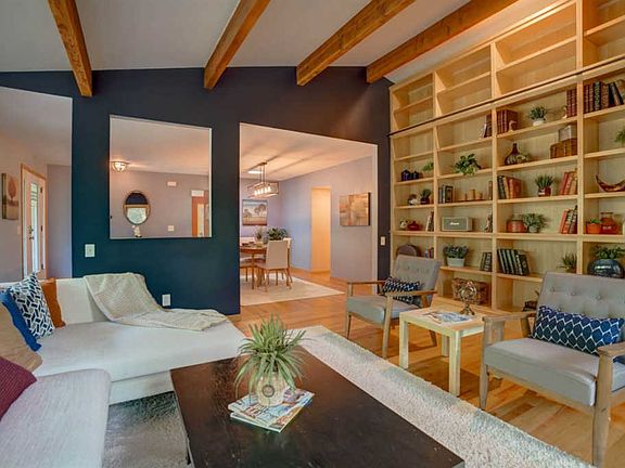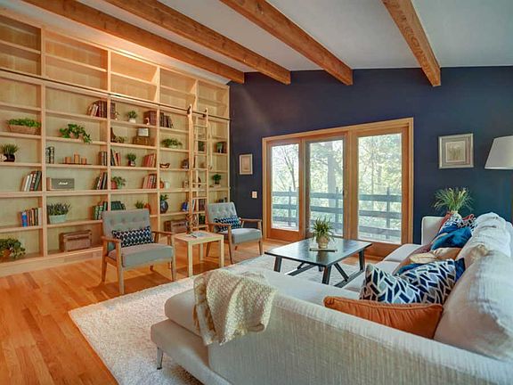 RARE find! You'll feel like you're in a tree house in this custom mid-century ranch set back from the road on a very private wooded nearly 1 acre lot located toward the end of a cul-de-sac. This free-flowing design has 5 bedrooms (enough to dedicate two as offices) and a big gulp of beauty immediately upon entering...gorgeous vaulted ceilings and solid beams in a large living room with amazing custom solid wood built-ins and solid wood floors.This woodland retreat has a formal dining room adjacent to the living room and kitchen with a huge island and a spacious informal dining area open to the patio and private, wooded back yard. Some updating and TLC could be considered with great return on your investment in this neighborhood, or move right in and enjoy.