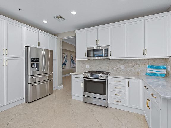 Experience refined coastal living in this beautifully renovated first-floor residence, perfectly positioned to capture tranquil lake and golf course views within the coveted Montreux enclave of Fiddler's Creek. Designed with elegance and livability in mind, this spacious three-bedroom, three-bath home lives like a single-family residence, offering a private entrance, attached two-car garage, and an open, light-filled layout. The gourmet kitchen impresses with quartzite countertops and backsplash, white cabinetry, stainless steel appliances, and a charming breakfast nook overlooking lush tropical gardens. Each of the three bathrooms has been completely renovated, showcasing elegant finishes, modern tilework, and spa-like details throughout. The serene owner's suite opens to the lanai and features dual walk-in closets and a beautifully updated bath with a soaking tub and frameless glass shower. Additional enhancements include a freshly painted interior, designer lighting, and a brand-new HVAC system, creating a move-in-ready retreat that blends comfort and modern sophistication. A screened lanai provides the ideal setting for morning coffee or evening gatherings, framed by sweeping water and golf vistas. Montreux is currently undergoing a community-wide landscaping enhancement, further elevating the neighborhood's beauty and appeal. Residents enjoy access to the award-winning Fiddler's Creek Club & Spa, offering fine and casual dining, resort-style pools, a full-service fitness center, spa, tennis, pickleball, and an active social calendar. Optional golf, beach, and marina memberships further enhance the unparalleled Florida lifestyle this residence affords.