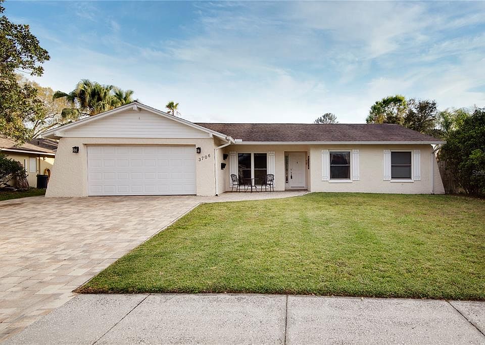 BRAND NEW ROOF JUNE 2024!!! You are pressed to find a more turn key house than 3706 Orangepointe Rd. No CDD or HOA to worry about. This 4 bedroom 2.5 bath house sits at 2,018 sqft heated with a TRIPLE driveway, FULLY powered by a solar panel system (panels paid off $$$) and a backyard you'll never want to leave! As you enter the front door, you'll instantly look directly through the home's new kitchen/dining layout directly into the inviting backyard through the new sliding glass door (1 of 2). The home offers an open floor plan with master split on one side and the other bedrooms on the opposite end of the home with a second bathroom nearby. Laundry room and a half bath line the hall leading to the garage, keeping plenty of space away from the main living areas, creating a perfect entrance and barrier from the noises! The home offers a fully remodeled kitchen with REAL MAPLE cabinets, stainless steel appliances, quartz countertops, custom built walnut/maple wood backsplash over the double sink area, oversized closet style pantry and so much more! Air conditioned garage with professionally installed epoxy flooring (MAN-CAVE???). Make your way to the Backyard through the newly installed triple slider off the dining room or through the living room out into the covered patio area. Relax with your morning coffee or evening cocktail to the sound of the water feature in the oasis of a fenced backyard that never needs mowing! The beautiful pool includes a large screen enclosure, detached hot tub (included with purchase). Modernized local park, walk-able within minutes! Park includes pickle-ball courts, Tennis courts, Basketball courts and more, a MUST-SEE! Come and see the home, you DESERVE, before someone else beats you to it!