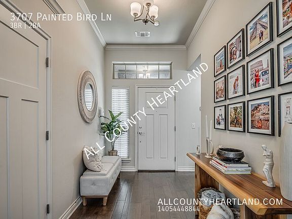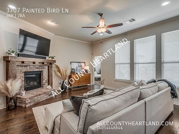 This charming 3-bedroom, 2-bathroom home is nestled in a friendly, well-maintained neighborhood. As you step inside, you'll be greeted by a spacious, open-concept living area with plenty of natural light. The cozy living room features a beautiful fireplace, perfect for cozy evenings. The kitchen is a modern delight, complete with sleek stainless steel appliances, ample counter space, and plenty of storage. The primary bedroom offers a peaceful retreat, complete with an en-suite bathroom, while the two additional bedrooms provide versatile space for family, guests, or a home office. Washer and dryer included. Step outside onto the private back patio, an excellent spot for outdoor dining, grilling, or simply unwinding in the fresh air. In the garage there is a storm shelter for added safety. The home is situated in a peaceful, desirable neighborhood, which features a walking trail, splash pad, playgrounds, ponds, and soccer field making it the perfect place to call home. Every All County Heartland Property Management residents are enrolled in the Resident Benefits Package (RBP) for an additional fee which includes liability insurance, HVAC air filter delivery, on-demand pest control, and much more! No Smoking. 2 Bath 2 Car Garage 3 Bedroom Disposal Hood Vent Microwave Oven Stove/Range Washer/Dryer Washer/Dryer Hook Up