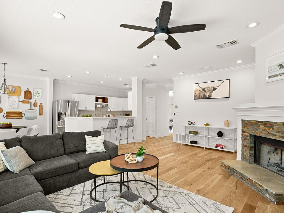 Cozy fireplaceDedicated officeFresh interior paintRecently installed wood flooringAbundant natural lightBack patioPeaceful backyard views