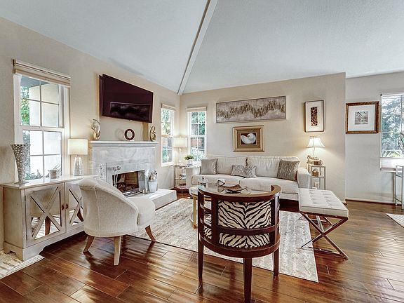 Beautiful 3/2 condo w/loft. This spacious private end-unit lives like a single-family home surrounded by trees and greenery. Well-designed w/2 bdrm + bath down, upstairs a spacious primary suite with large closets, generous bath, soaking tub, dual vanities, and shower. This luxurious home features hardwood floors throughout, w/designer touches in lighting, stone FP, granite counters, stainless appliances, laundry, storage & 2-car garage. The open floor plan has high ceilings drenched w/natural light, lovely entertaining patio opening to private side yard. Franciscan Villas features a large pool, spa, greenbelt and playground. Located minutes to W.Foods/shopping/restaurants. This is a rare move-in ready home blending style,space and privacy in heart of SB.