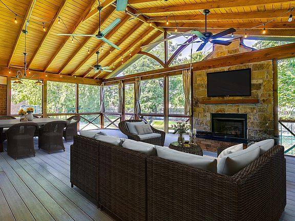 Escaping to your private oasis: The incredible backyard is an entertainer's paradise, with a HUGE 30' x 20' covered and screened deck featuring a vaulted ceiling, charming string lights, and ceiling fans. Perfect for game day gatherings or relaxing evenings!