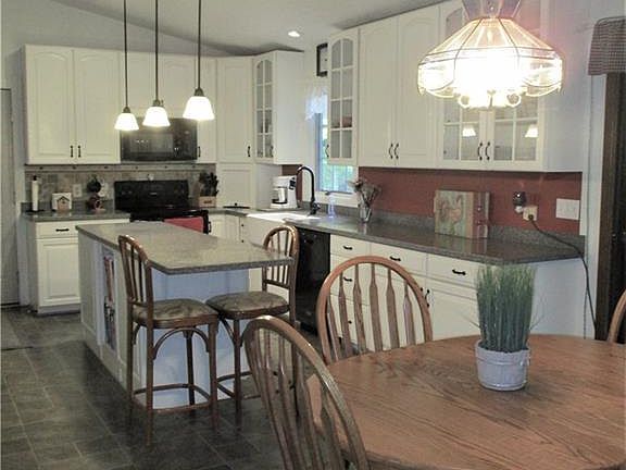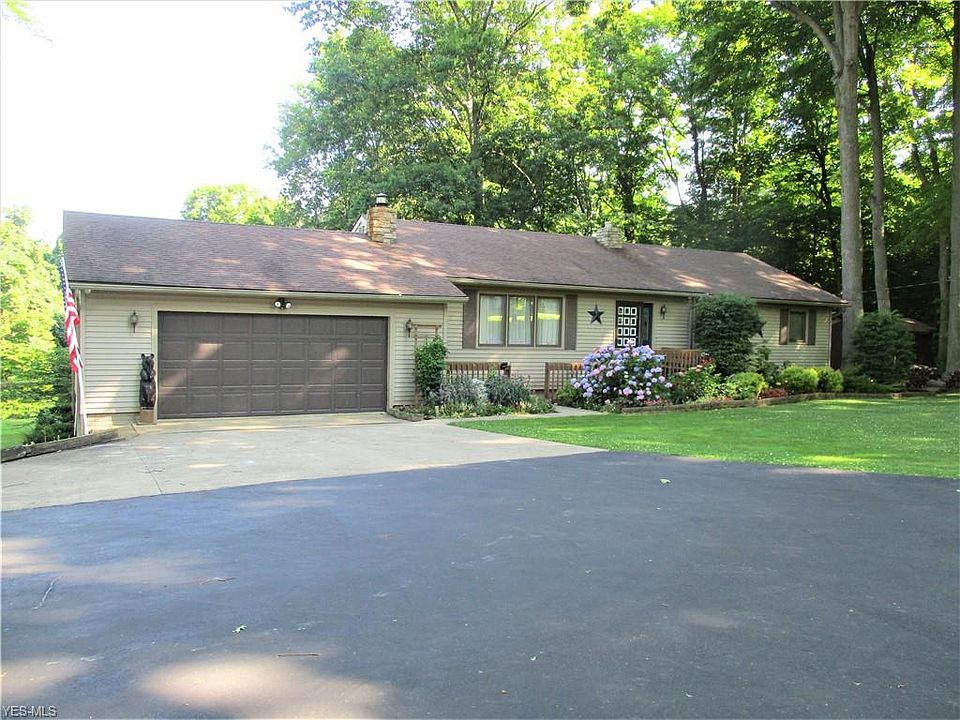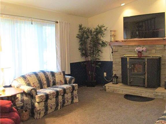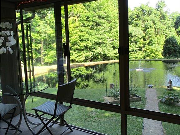 Looking for a little piece of back yard paradise? Vinyl sided ranch with a full finished walk out basement. Gorgeous updated white kitchen with Corian counter tops and farmhouse sink. Center island with breakfast chairs. Dining area, vaulted living room, master bedroom with full bath featuring a brand new shower. 2nd bedroom features built-in bed and cabinetry. Lower level finds a family room, laundry room, full bath, bonus room and a workshop/utility room. Sliders from the lower level open to your back yard. Stunning views from 4-season sun room, deck and pristine back yard view of a 1/4 acre stocked pond with fountain, wooded view. Under the sun room is an enclosed storage area for your coal storage and yard items. 2-additional storage sheds, 2-car attached garage and extra paved parking areas. Lots of additional updates - furnace and heat pump 2008, kitchen appliances, wired for a generator, hot water heater 2017. Central air, security system are just of the few great bonuses on this ranch home. Electric costs $100-$130 monthly and sellers purchase 3 skids of coal for winter months at approx. cost of $1,000 year. You do not have to use the coal stoves - this home has an electric furnace and heat pump. Seller will remove the coal stoves if unwanted by Buyer. 1,400 sq. ft on the main floor plus 15 x 12 heated sun room and finished basement with sliding doors to the back yard. *** New carpeting for lower family room installed 9/21***