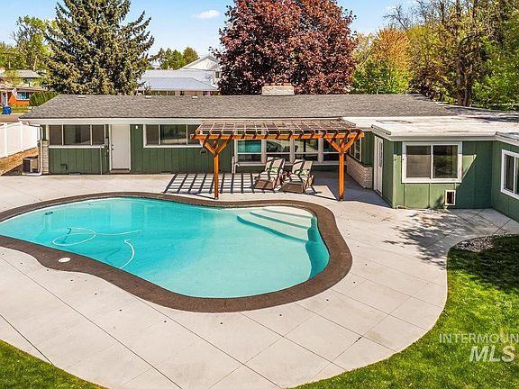 Stunning mid-century Boise gem on Depot Bench offers modern updates & spacious resort-style back yard w/sparkling in-ground pool & new privacy wall! Extra large .66-acre fully landscaped lot just up Americana Blvd from Ann Morrison & Kathryn Albertson parks, Greenbelt, dog parks & more! Vaulted ceilings w/exposed beams, rich wood accents & double-sided white stone fireplace. Kitchen offers SS appliances, quartz countertops & step-down dining nook w/built-in bench seating. Bright picture windows fill home w/natural light. Updated baths & stylish flooring (incl. true hardwood) enhance comfort & flow, while living room boasts custom built-ins for added charm. Plenty of storage, there’s space for home office/gym/flex or workshop to suit your lifestyle. Step outside to your private backyard sanctuary—a true retreat featuring pristine pool, concrete patio, mature landscaping & pergola for shaded lounging. Offers the best of both worlds—classic architecture w/today’s style. Bonus: MX-1 zoning for multi-fam & comm.