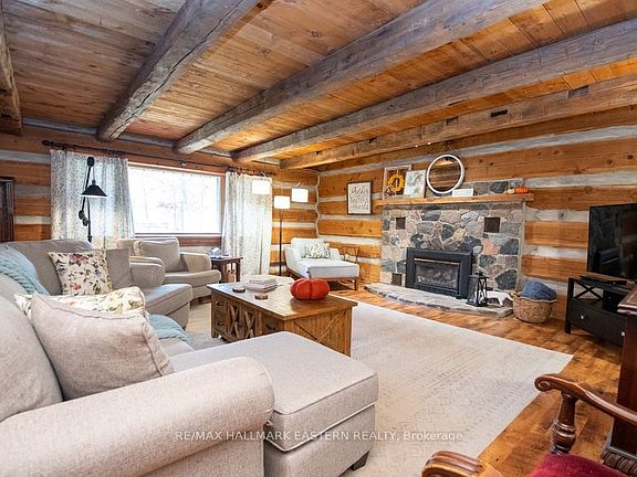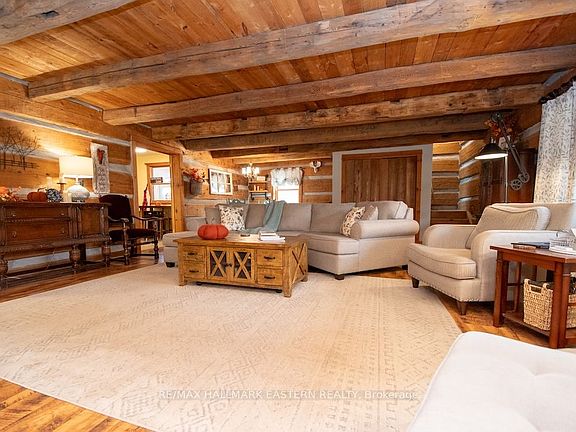 Beautiful Log Home with 3,300 Sq. Ft. of living space known as "Whipoorwill House" is located at the centre point between Hastings, Warkworth and Campbellford within 10 minutes of amenities, arenas, schools and the hospital. This unique home has been maintained with extra care and has 3 bdms, 2 baths. It is situated on a 1-acre lot with a metal roof, beautiful towering oaks, raised gardens and ample outdoor space. The interior features two beautiful fireplaces, one of which is a stone fireplace, hardwood flooring, a very spacious and updated main kitchen, recreation/music room, massive 18" round log beams and a large laundry/hobby room. This home features lovely covered front porch and a fully insulated 30' by 10' sunroom. There is an oversized 2 car garage with windows and separate power. This stunning home also features skylights for natural light, exposed beams, and is truly a unique must-see log home.