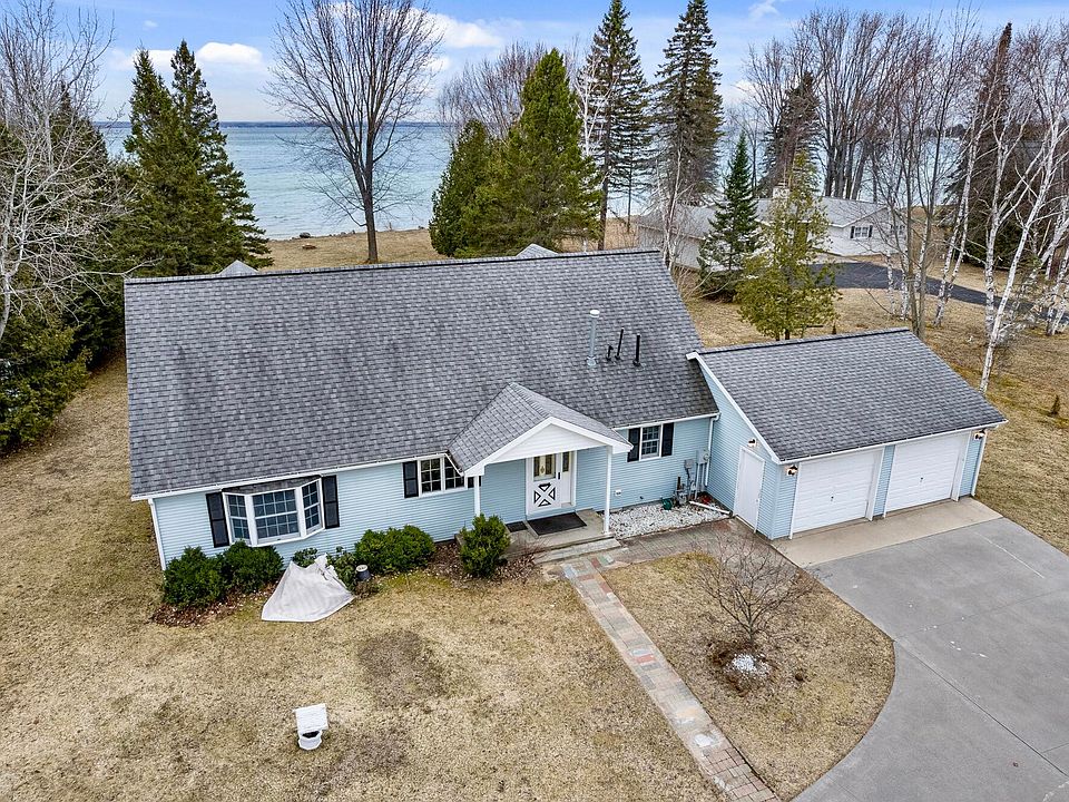 Experience the bliss of Mullett Lake living at this wonderful west shore home. This 3 bedrooms and 2 baths home on the leeward side of the lake offers a spacious layout of the main living areas that welcomes all. The waterside primary bedroom and living room offer direct access to the covered porch and lakeshore. Upstairs, find expansive bedrooms and a central bathroom providing space for your many guests. The sprawling lot leads to the water's edge, showcasing a quality sand bottom with close access to the Cheboygan River. Enjoy the convenience of a concrete circle driveway, 2-car garage, paved road access, high-speed internet, and proximity to Cheboygan amenities making this a great choice for a permanent residence or idyllic cottage retreat.