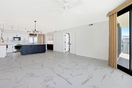 Penthouse wide ocean viewLarge balconyStylish tile flooringSliding glass doorKitchen islandArchitectural sophisticationWolf range