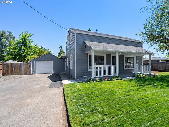 OPEN HOUSE SAT & SUN, 7/13 & 14,11AM to 1PM. Better than new and ready for a new homeowner. Located in a lovely neighborhood on large .15 private lot. This beautifully update home has 3 bedrooms, 2 full bathrooms, 1328 square feet with a large detached garage that has MORE than many possibilities. Improvements include, new door & window casing, new baseboards, drywall and texturizing, new laminate flooring, new carpet in bedrooms, both bathroom are completely new. Updated kitchen: with quartz countertop, sink and appliances. New paint inside and out. Several electrical and plumbing updates completed. Home has newer roof and garage has new roof 2024. Beautiful lush landscaped grounds, huge fenced backyard, fully covered back patio, garden area, and firepit. Home has newer windows and siding. Notice the detached large garage, this would make a perfect home office, shop, or possible ADU (check with county). The driveway holds up to several vehicles, RV or boat. Lots of room on this big lot! Stretch out and enjoy your new home. Oh, don't forget all the many hours you will enjoy sitting in your rocking chair on your full length covered front porch with drinks, coffee and friends. Welcome home! 50 minutes to Portland - 60 minutes to Eugene.