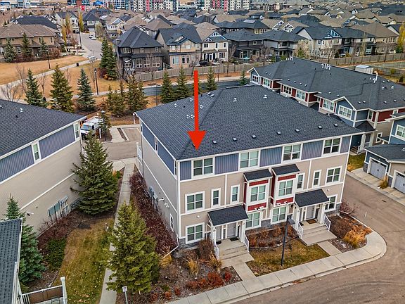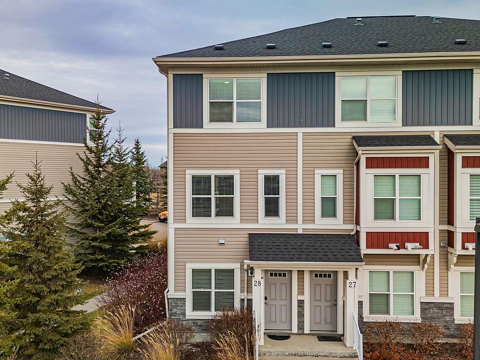 WELCOME to this modern and affordable 2 bedroom + den townhouse, ideally located across from Dr. Margaret-Ann Armour School. This corner unit features extra windows and 9-foot ceilings on two levels, creating a bright, open living space. The kitchen offers stainless steel appliances, a large island, and extended cabinetry which is perfect for daily living or entertaining. The dining area opens to a balcony overlooking a park/trail. Upstairs, two spacious bedrooms each feature a 4-piece ensuite and his/her dual closets. Ground-level den/home office is great for remote work or study. Enjoy the convenience of an attached heated garage (23x13) and driveway parking. Steps from public transit and minutes to the Currents of Windermere, schools, shopping, and the Anthony Henday. An exceptional choice for first-time buyers, downsizers, or investors!