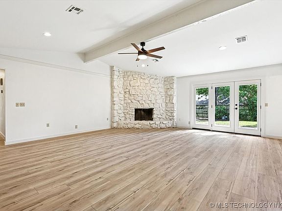 Home situated in a neighborhood that offers a park and swimming pool. Located close to shopping, dining, and highway access awesome kitchen and breakfast room, formal dining, large laundry room. large living area with vaulted ceilings and an impressive stone wood burning fireplace. Generously sized secondary bedrooms also offer walk-in closets. Beautifully Updated. Move-In Ready. Low-maintenance vinyl windows. Stainless steel appliances. Prime South Tulsa Location! Located in the desirable Forest Creek neighborhood in the Jenks school district (minutes from Jenks East Elementary). This incredible home has been stylishly updated throughout. The large living with its vaulted ceiling and impressive stone wood-burning fireplace flows beautifully into the dining room providing the perfect space for entertaining friends and family. And did I mention the fully renovated kitchen with sleek new cabinetry, desert rose quartz countertops, and stainless-steel appliances? This kitchen is the perfect blend of modern and function - full-height pantry, oversized pot drawers, and amazing cabinet hardware – and it is open to an ample sized breakfast room. Three generously sized bedrooms all have wonderful walk-in closets. The primary bedroom has an on suite bath with two separate new vanities in the same sleek design as the kitchen cabinets. Special features include: 36” wide doors throughout for easy mobility; extra large laundry with walk-in pantry; newer vinyl windows; new LVP floors in entry, living and dining; new carpet in bedrooms and closets; fully restored ceramic tile in kitchen, breakfast room, laundry, and baths lend to the California-modern tone on-tone aesthetic. New 2025 updates: new roof, new gutters, new electrical box, new exterior paint, new interior paint, new door hardware, new plumbing fixtures, new lighting in each room.