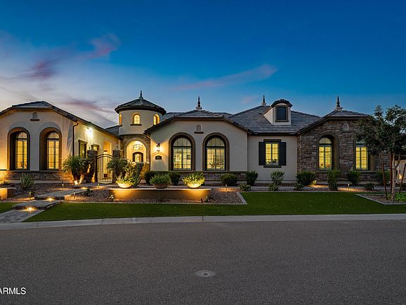 Located in the exclusive gated Estates at Mandarin Grove, this 2021built French Countryside-inspired estate rests on a premium N/S .63-acre corner lot. Towering coffered ceilings and arched windows fill the open layout with natural light, while only the best upgrades highlight a refined palette, luxury finishes, and a stunning backyard. The chef's kitchen boasts high-end appliances, Cherry cabinets, granite counters, and an oversized island opening to the family room. With 5 en-suite bedrooms including dual East and West wing master suites, plus an office, piano room/den, private casita, and the 5th bedroom currently configured as a bonus room, the home offers elegance and versatility. Custom made for entertaining and everyday comfort, the home delivers an extraordinary lifestyle. The resort-style grounds are professionally landscaped to create the perfect setting for relaxation and entertaining. A sparkling pool with elegant water features and jets serves as the centerpiece of the backyard, surrounded by travertine decking and low-maintenance artificial turf. Multiple gathering spaces include a raised pergola and two covered patios, ideal for dining, lounging, or hosting intimate parties. A charming side garden awaits the green thumb, while the northeast corner of the lot is thoughtfully designed to accommodate a custom RV garage or guest housean exceptional opportunity for RV owners or those seeking additional space. The home's fully owned solar system keeps electricity costs low, while a four-car garage and a beautifully paved front courtyard complete this extraordinary estate setting.
