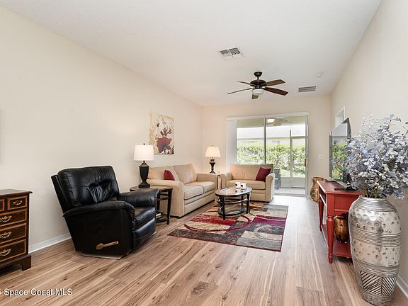 Nestled in the most prestigious 55+ resort-style community in Viera Is where you will find this better than new impeccably kept, move in ready villa. Brand new roof, gutters, freshly painted outside, accordion storm shutters, brand new mohawk wood flooring, all new whirlpool appliances, comfort height toilets, private back yard oasis. Enter into this open floorpan, featuring 2 bedrooms, 2 bathrooms and den,. Enjoy mornings and evenings on your private screened in patio. This villa has been crafted for a life of comfort, luxury, and vibrant community living. The resort-style amenities allow you to immerse yourself in the social scene, whether it's a refreshing dip in the exquisite heated pool & hot tub/spa, a game of tennis or pickleball, a light workout in the fitness center or a leisurely stroll through manicured pathways and community events. This community is close to everything,y et so far away from it all! Start living your dream resort style.