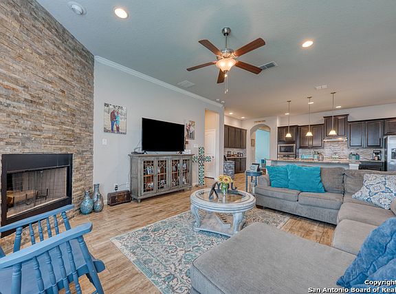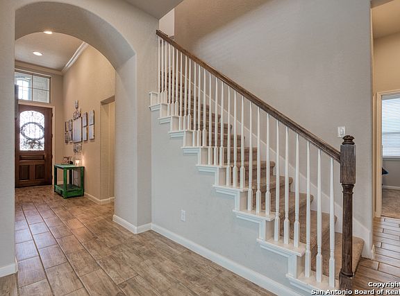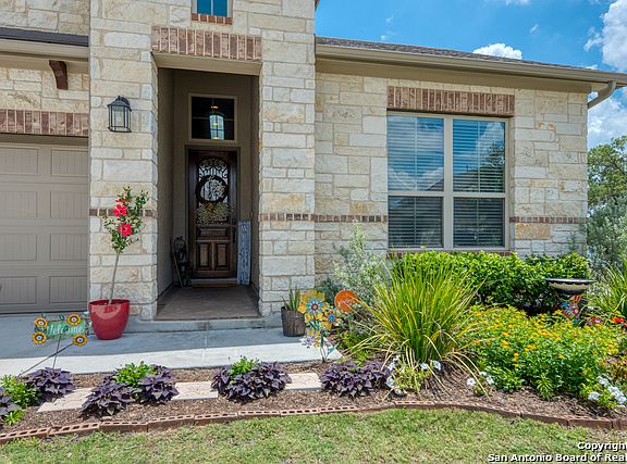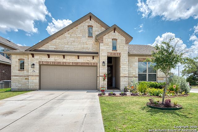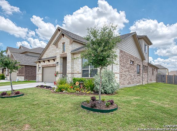 Located on a corner lot, this beautiful and bright 5 bedroom, 4 bath, 1.5 story home has 4 spacious bedrooms and 3 full bathrooms down, and 1 bedroom, 1 full bathroom and a large game room up. This lovely North-facing home is located in a quiet GATED neighborhood and has an open floor plan, a formal dining room, gorgeous wood-like tiles and a covered patio. The large island kitchen overlooks the cozy family room with an impressive fireplace with floor to ceiling stones. You will enjoy entertaining in this great kitchen which has gorgeous granite counter tops, 42" cabinets, stainless steel built-in appliances and a gas cook top. The master bathroom has a double vanity, separate shower and a garden tub and the master bedroom is separate from the other bedrooms. Great NEISD schools, easy access to highways, short commute to the airport and to shopping. Sod in backyard will be repaired/added to bald spots prior to closing.