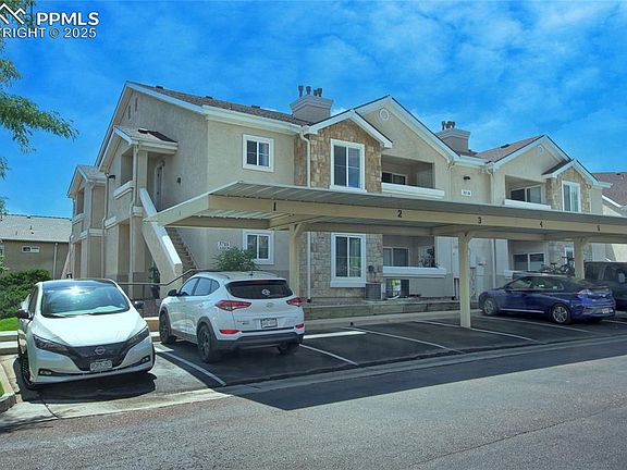 Exceptional 2BR, 2BA, upper end unit condominium in the highly desired gated community of Strawberry Fields. Light and bright with 1137 square feet of well designed living space with high vaulted ceilings and built-in architectural arches. Central air and heat for year round comfort. New canned lighting and front entry light fixture. The tiled Entry leads into a spacious vaulted Living Room with gas fireplace, great for entertaining family and friends. The Living Room flows into the Dining Area with a slider to a covered balcony to take in the Colorado sunshine! The Kitchen features a vinyl floor, pantry closet, breakfast bar for informal dining, and ample cabinetry and counterspace for kitchen storage and easy food preparation. Appliances include a dishwasher, electric range oven, vent hood, and refrigerator. Convenient in-unit Laundry Closet with electrical hookups. The Primary Bedroom is a private suite with neutral carpet, walk-in closet, walk out to the balcony, and adjoining Full Bathroom with vanity, mirror, and tub/shower. The 2nd Bedroom offers neutral carpet, a generous closet, and Full Bathroom with bedroom and hallway access. The covered balcony provides your own private storage closet. Reserved covered carport with lots of guest parking available. Strawberry Field residents enjoy top of the line amenities including a clubhouse, fitness area, pool, playground, and tennis courts. Close to schools, parks, and shopping with an easy commute to Fort Carson and downtown Colorado Springs. Don't miss the opportunity to make this MOVE-IN READY home your own!
