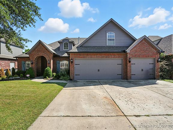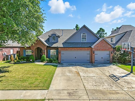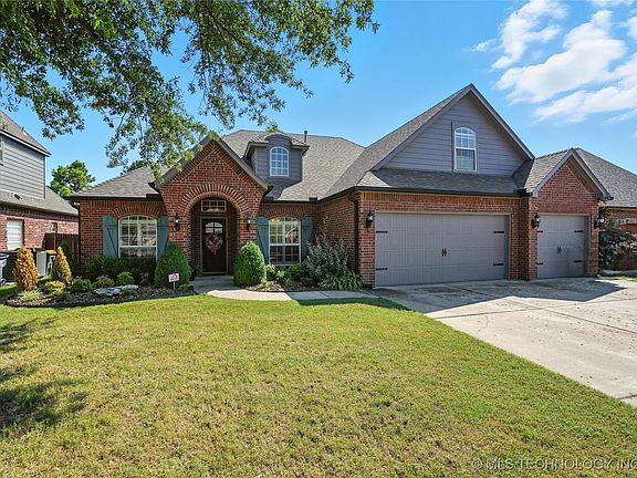 This timeless and welcoming brick two story features a deep backyard complete with cozy outdoor fireplace, nice patio, and lush landscaping prime for enjoying fall evenings. Three bedrooms, Two full baths, a hall bath, & formal dining downstairs. Game room and full bath upstairs with large attic that could be built out for a 4th bedroom. Spacious 3 car garage. Refreshing 2024 Kitchen update including cabinets painted, new gold pulls, plus a new LG Refrigerator and LG stove. All 3 1/2 bathroom vanities updated with paint. New floors in 2023. New Roof 2019. Freshly inspected and move in ready! Neighborhood amenities include a Pool, Playground, Splash Pad, trails, and ponds with miles of sidewalks. Located in Country Woods of Jenks, within minutes of Tulsa Hills and ideally located near HWY 75 and the Creek Turnpike. Easy commute downtown.