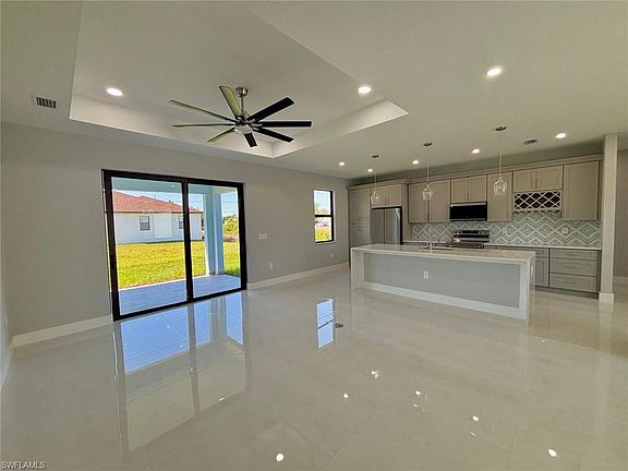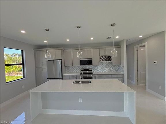 Welcome to this beautifully appointed single-family residence, offering 3 spacious bedrooms and 3 full bathrooms across 1625 square feet of thoughtfully designed living space (2407 total square feet). This home exudes modern elegance with soaring nine-foot ceilings throughout, complemented by tray ceilings in both the living room and master suite, enhancing the sense of space and style. The open-concept layout seamlessly connects the walk-through kitchen - featuring a double oven with all Samsung kitchen appliances and abundant cabinetry - to the expansive living and dining areas, ideal for both everyday living and elegant entertaining. A unique highlight is the full bathroom and walk-in closet integrated within the garage, delivering additional convenience and functionality. Step outside to a massive lanai, already plumed and powered for an outdoor kitchen, perfect for al fresco dining and hosting gatherings year-round. Additional features include a full irrigation sprinkler system with outdoor lighting all around home and prime location offering excellent access to nearby amenities, shopping, recreation and schools for the kids. This home strikes the perfect balance of comfort, efficiency, and luxury - an exceptional opportunity not to be missed