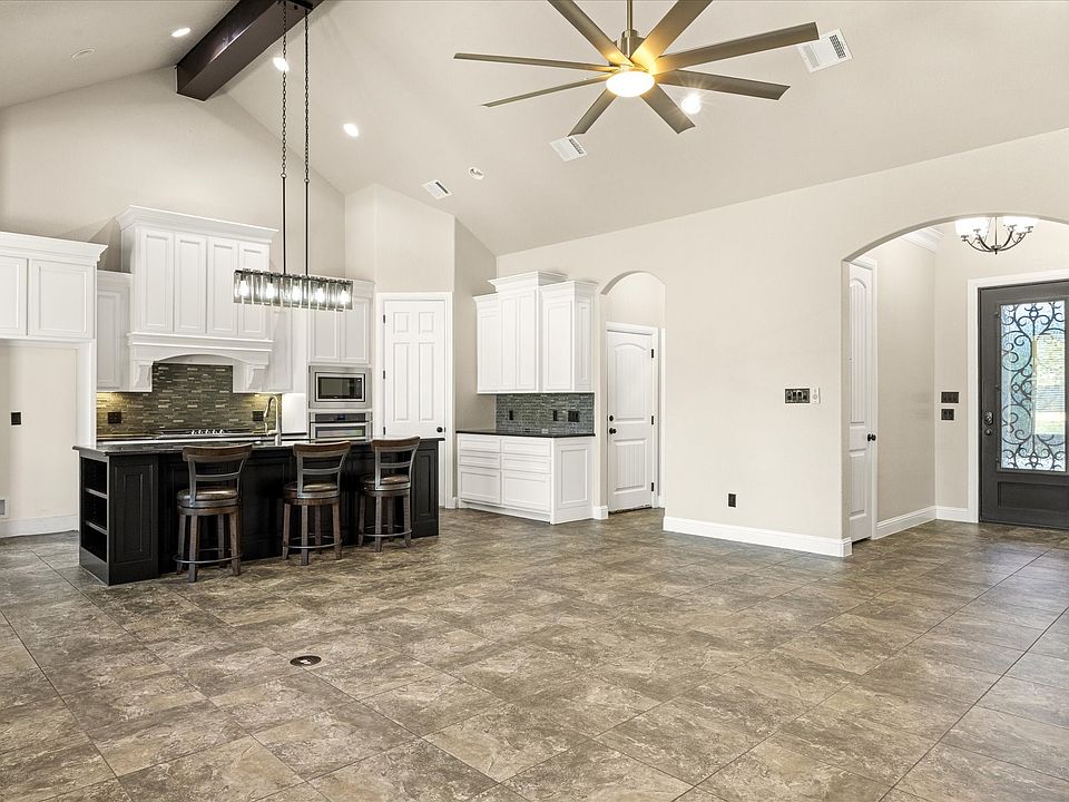 Stone hearth lp fireplaceStainless steel appliancesIrrigated lawnCovered patioJetted tubPipe fenced backyardSoaring vaulted ceilings