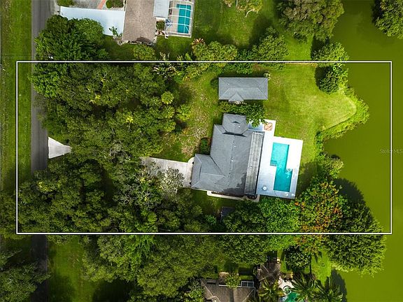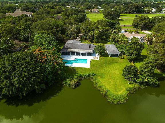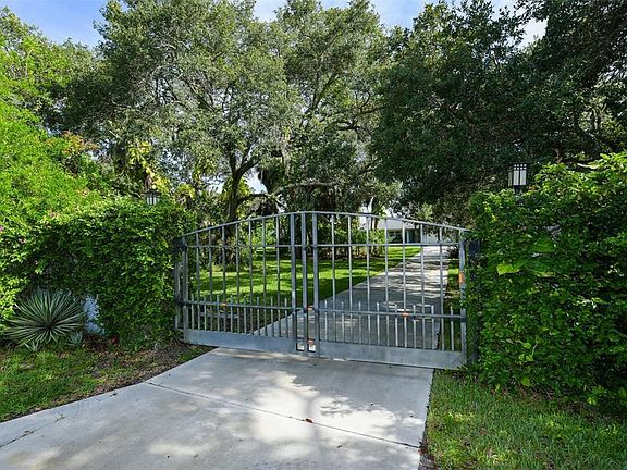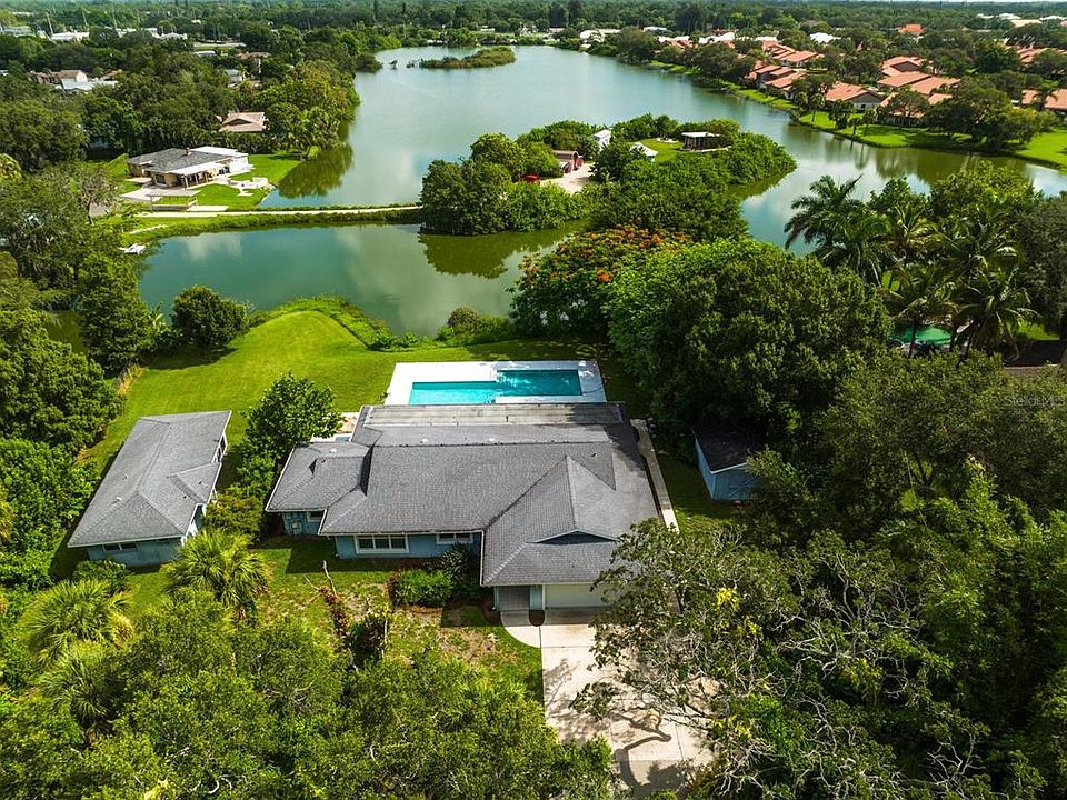 Behind a vine-covered wall hiding it from the street, through a private gate, this secluded 1.5-acre oasis overlooks Mirror Lake, a private 17-acre lake that is home to a variety of wildlife and birds along its shoreline. The main home is set way back on the property and the gigantic front yard is filled with Majestic old Florida oaks and native flora that create a shady canopy over your own botanical garden. The main house has 3 bedrooms, 3.5 baths, with an open concept floor plan. An abundance of sliders shows off the gorgeous water view and invite the outside in. Updated kitchen features center island, miles of countertops, cabinetry, and stainless-steel appliances. All the bedrooms are oversized with custom built-in storage. The screened lanai, ideal for Florida living, overlooks the lake and stretches across the entire length of the back of the home. The backyard contains a massive open patio and huge swimming pool, perfect for entertaining. The separate Guest House has a bedroom, bathroom, kitchen, laundry room and a great living area with its own lanai and lake view. Both buildings have separate security systems and enjoy a pool bath. Ideally located off Beneva Road, just south of Clark Road and literally minutes to Siesta Key Beach, shopping, dining, medical and I-75. No deed restrictions, no HOA fees. See this very private property today and be enchanted by all the possibilities.