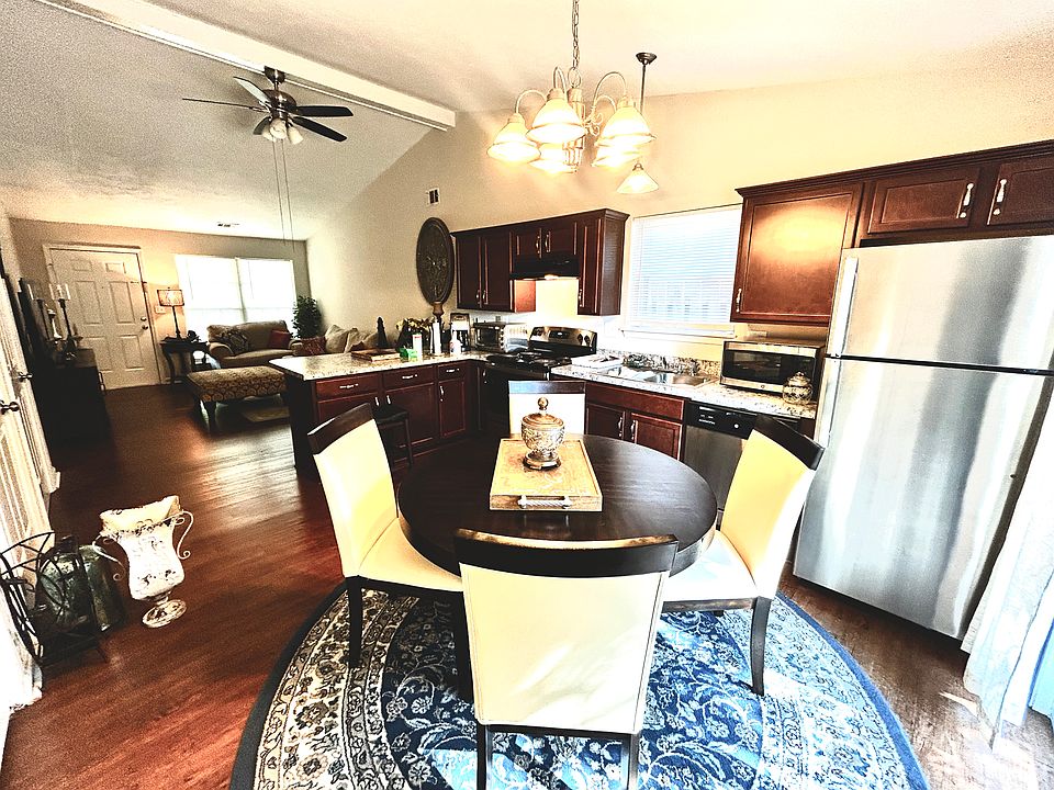 Rear patioPrivate off street parkingLarge open floor planVaulted ceilingsPrivate bathDouble closetsLarge primary bedroom
