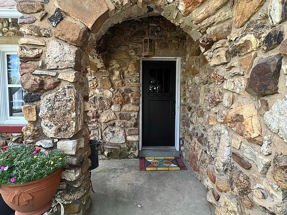 Native Stone 2 Story Farmhouse on 16 acres 4 bedrooms total with 2 upstairs and 2 on the main floor. Bathroom was remodeled in 2012 has Oak cabinetry and walk-in shower. Built in Shelving and Arched doorways give this home its Character. Native Stone Fireplace with Ashley Insert and Blower. Central AC and heat is propane or outdoor wood furnace. Kitchen and parts of the house are in various stages of remodel.24x30 Two car Detached Garage/shop with concrete floor, electric LP ventless heater also has 13x30 leanto. 12x17 Storage/wash room and 6x6 well house are matching Native Stone. 16 acres mostly hay field with wet weather creek winding thru it.