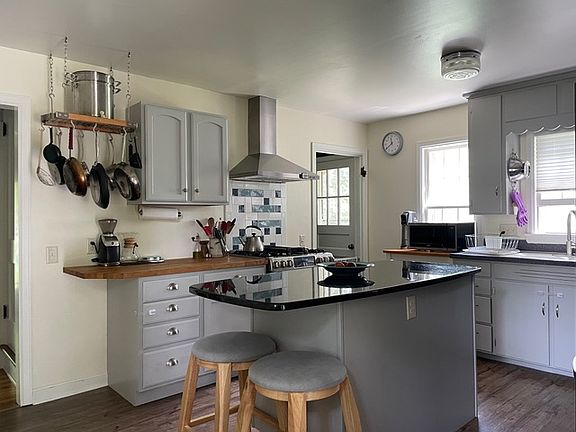 The large kitchen is stocked with everything the home chef could desire, including a dual-fuel gas range/electric oven, French door refrigerator, and kitchen island for gathering.