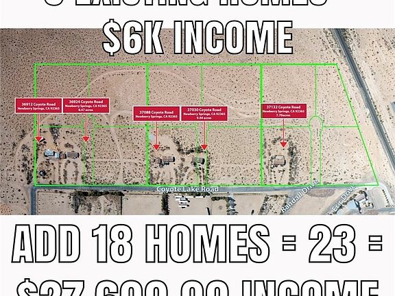An archeological study has been completed, providing peace of mind for any future endeavors. The subdivision potential is immense, with the possibility to create 9 approximate 2.77-acre lots. Each of these lots has the potential for two homes, allowing for a total of 18 new homes to be placed or built. 23 income-producing properties IS generational financial windfall. Residents can enjoy their horses, ride their toys to The Mojave River Basin directly from their homes under majestic sky and mountain views or also enjoy hikes and camping at Calico Ghost Town Regional Park. Calico Ghost Town was Designated a California Historical Landmark in 1962. Only 90 Minutes from both Vegas or Laughlin.