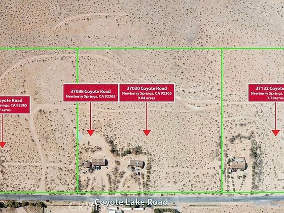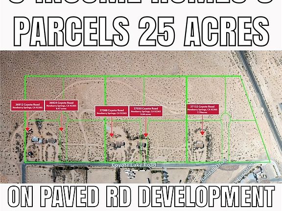 These parcels of land totaling 25 plus acres are on prestigious Coyote Lake Rd in Newberry Springs, California. As the original developer of Crystal Lake holds these cash flowing assets with great potential to 24 total homes - this opportunity is unparalleled. Situated on paved Coyote Lake Rd and connected to the Coyote Lake Water System, these parcels are ready for immediate utility access, making development a seamless process. Splitting these parcels into 4 lots and each having two homes is what's already commonly done here and you wont have to deal with the added subdivision red tape.