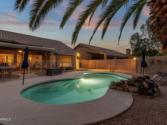 Escape to your own retreat in Gilbert, Arizona, where a backyard haven offers a blend of luxury and tranquility. The split ranch floor plan offers an ideal layout for privacy and open living, perfect for families and entertaining. The kitchen features high-end stainless steel appliances, granite countertops, and a central island, seamlessly connecting to the spacious living and dining areas. The master suite is a private retreat with a walk-in closet and an ensuite bathroom featuring dual sinks, a soaking tub, and a separate shower. Three additional bedrooms share a well-appointed bathroom. Step outside to enjoy the backyard oasis, complete with a sparkling pool, heated spa, and a view fence overlooking a peaceful wash. The property also includes an RV gate, providing convenient storage.