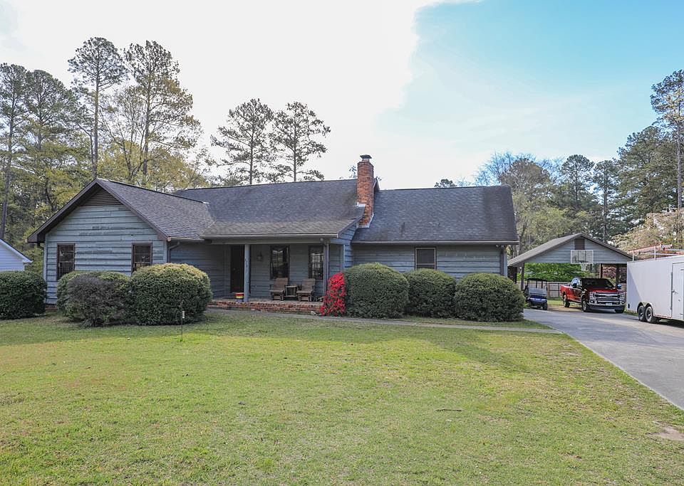 Great cedar sided home has 4 bedrooms & 3.5 baths. Also features a large bonus room along with the 4th bedroom & bath upstairs. On the main level there is your den with rich cedar walls & brick fireplace. A beautiful formal living room with hardwood floors. The kitchen has great cabinet space & lots of counter room. Large dining area & master BR suite has a walk in closet. Outside, you have a double garage & double carport, a nice front porch & back deck. ! Location includes the convenience of The Club at Lake Sinclair right across the street, with swimming, tennis, pickleball, food, golf, & community boat ramp just down the road, schools, churches, & Kroger all within a few miles! Current owner made great updates to a substantial portion of home.