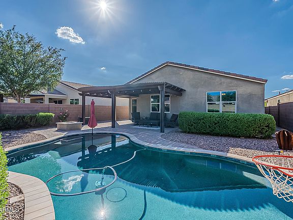 Beautiful almost new Meritage home with a pool added in 2020 featuring a travertine edge and basketball hoop. The backyard is an entertainer's dream with a pergola, covered patio, extended pavers, and a fire pit oasis. Inside, you'll find granite counters in the kitchen, marble with double sinks in both baths, a custom pantry door, and vinyl plank flooring throughout (no carpet!). The 2.5-car garage includes shelving and an epoxied floor so you can park 2 cars and have storage space, plus the laundry room offers cabinets and a sink. Refrigerator, washer, and dryer convey. Well-maintained and move-in ready with so much growth happening all around the area!
