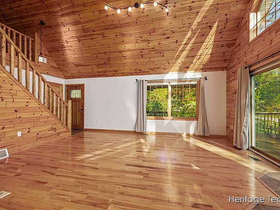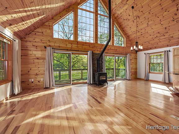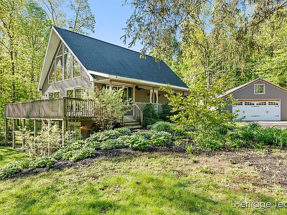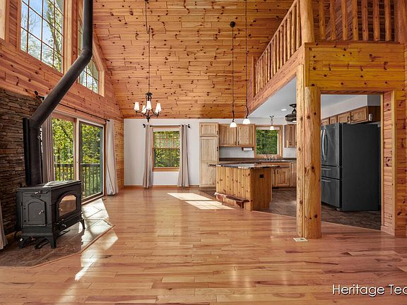 Beautiful A Frame modular home on a 2-acre serene wooded lot, flowering and mature trees, and retreat-like setting. Open plan, kitchen with hickory cabinets, granite island and stainless appliances, dining area and living room with wood stove and double sliders to a covered wraparound porch. Knotty pine cathedral ceiling and accent walls, tiled and wood floors, and abundant natural light. Primary suite loft with walk-in closet, primary bath with shower and stand-alone soaker tub. Two bedrooms on the main floor, full bathroom and mudroom/laundry room with wash sink. Solid pine doors throughout. Walk-out lower level with recreation room, double decorative walk-out doors, kitchenette with bar, wall furnace, pine walls, metal ceiling, painted flooring, carpeted flexible room, full bathroom with shower, utilities and storage room with shelving, and storage shelving under wide steps. Extra deep two-stall garage, 24 x 36, with back overhead access door, and outdoor spigot behind. Large back patio, open shed with lean-to, and decorative split rail fence.