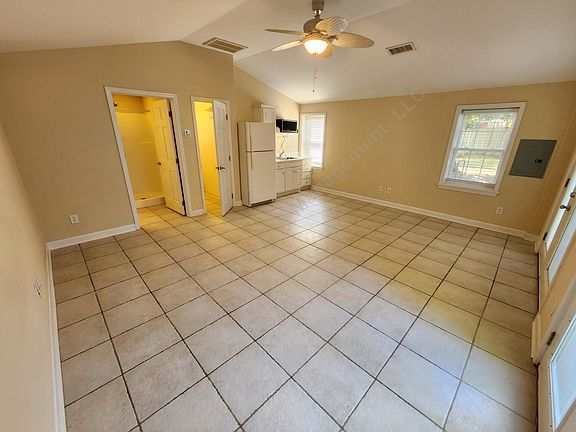 Efficiency garage apartment with living room/bedroom, 1 bathroom, kitchen with refrigerator, central heat and air, common area laundry facility, tile floor, on street parking, cats only, rent includes electricity and water.