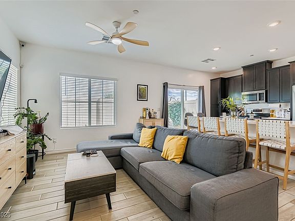 Step into this charming townhouse at 3717 Canis Minor, Unit 11101, featuring upgraded tile flooring throughout the first floor and plush upgraded carpet upstairs. The modern kitchen boasts sleek quartz countertops, elegant cabinets, and stainless-steel appliances. With 1771sqft, this home offers 3 spacious bedrooms and 3 full baths, providing ample living space. All appliances are included for your convenience, while blinds and ceiling fans enhance comfort and privacy. Step into the backyard to find a thoughtfully designed pavered patio and low-maintenance synthetic turf, perfect for outdoor relaxation. Community amenities include a gated entrance, picnic area, and a refreshing pool. The prime location is just moments away from Raiders Practice facility, dining, shopping, healthcare and easy freeway access. This home harmoniously combines style, functionality, and location, making it a must-see!