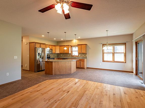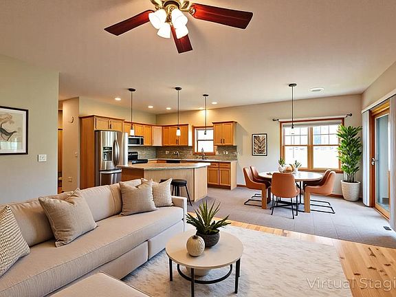Sophisticated open-concept ranch-style twin home designed with comfort and elegance in mind. The sunlit kitchen shines with solid surface counters and quality finishes, flowing seamlessly into the dining and living areas with gleaming hardwood floors. Retreat to the master suite with a full bath and a walk-in closet. Main floor laundry adds ease to daily living. The finished lower level impresses with a spacious family room, egress windows, a bedroom, and a full bath. Step outside to a newer deck overlooking a beautifully maintained yard, perfect for outdoor enjoyment. The garage is enhanced with custom cabinetry, offering both style and function. A refined home that blends modern luxury with everyday convenience!