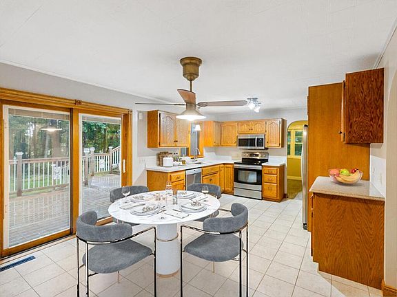 Charming North Branch 2 story situated on 1 acre lot with mature trees & white picket fence! Classic archway between dining & living room, cozy gas fireplace, hardwood floors. Spacious tiled kitchen, with eat in dinette, custom cabinetry, quartz countertops & SS appliances. Patio door leads to backyard with deck, storage shed & gardens. Upper level offers 3 bedrooms & tiled full bath. The Lower Level features a brick wall & woodburning stove. Lower office, abundance of storage in the laundry area & separate storage room. New furnace! The garage is insulated, heated & has pull down storage. Spacious garage is 25 ft deep, concrete driveway has an additional parking pad next to garage. Awesome raised gardens & much more! Available now due to sellers job relocation. MUST SEE!
