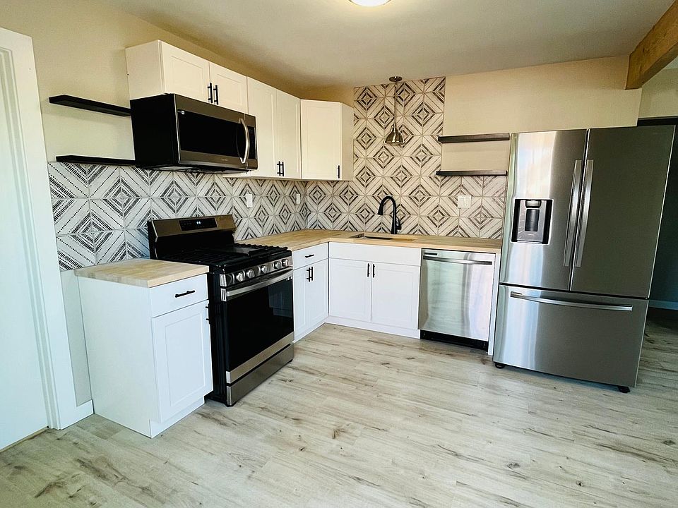 Fully fenced in propertyNew appliancesButcher block countertopsPlenty of storageOff street parkingExposed beamSliding glass doors